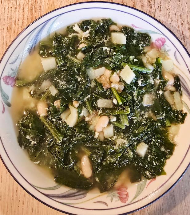 Sometimes you have to eat like a peasant. It's good for the soul. Today was a bastardization of escarole in chicken broth with cannellini and potatoes. The escarole looked like shit at the market today, so I'm using turnip green leaves. No pancetta, so I made some ciccioli from bits of fatback I had lying around, in which I fried minced garlic, diced potatoes, and well chopped turnip greens. Added the broth and beans with a tablespoon of Parmesan cheese and added some reserved egg wash from last night's cod. Pretty nice, considering. Would have preferred my Mom's, but fuck it, work with what you've got. #soup