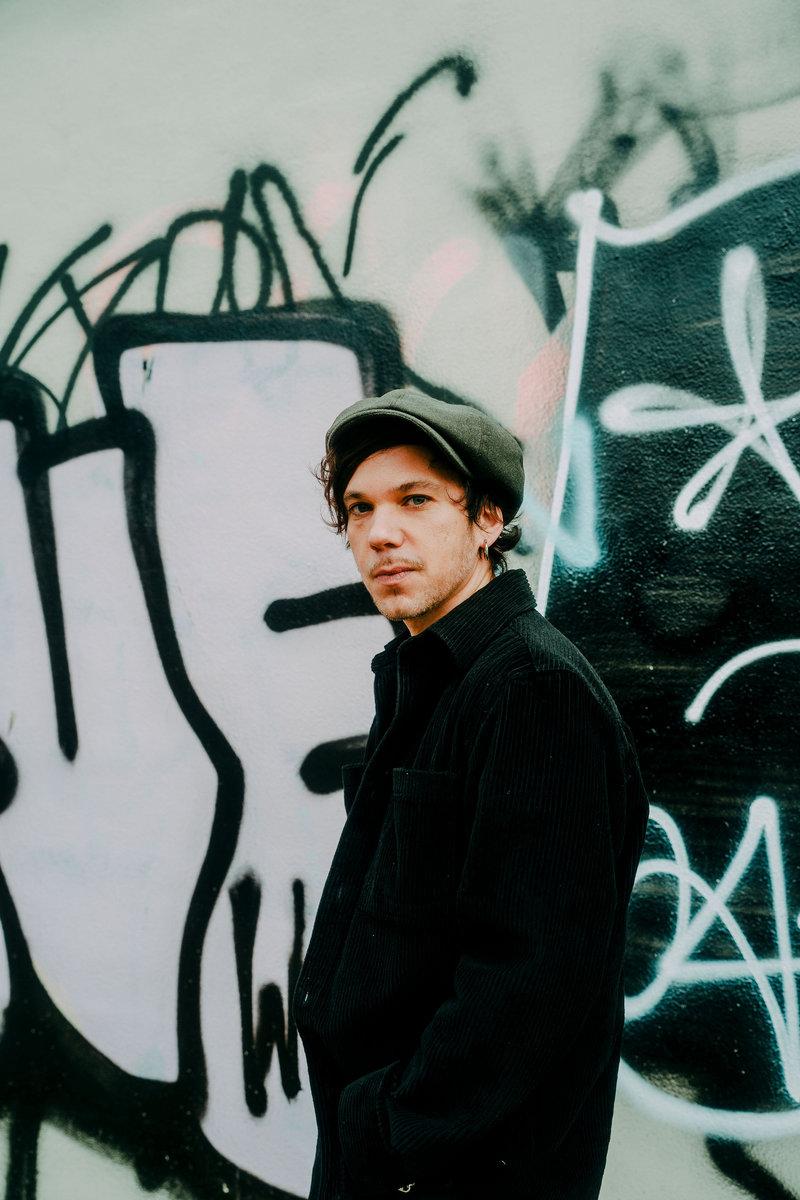 Tiwayo in a black jacket and cap stands before a graffiti-covered wall, looking serious. The background is urban with bold, abstract patterns.