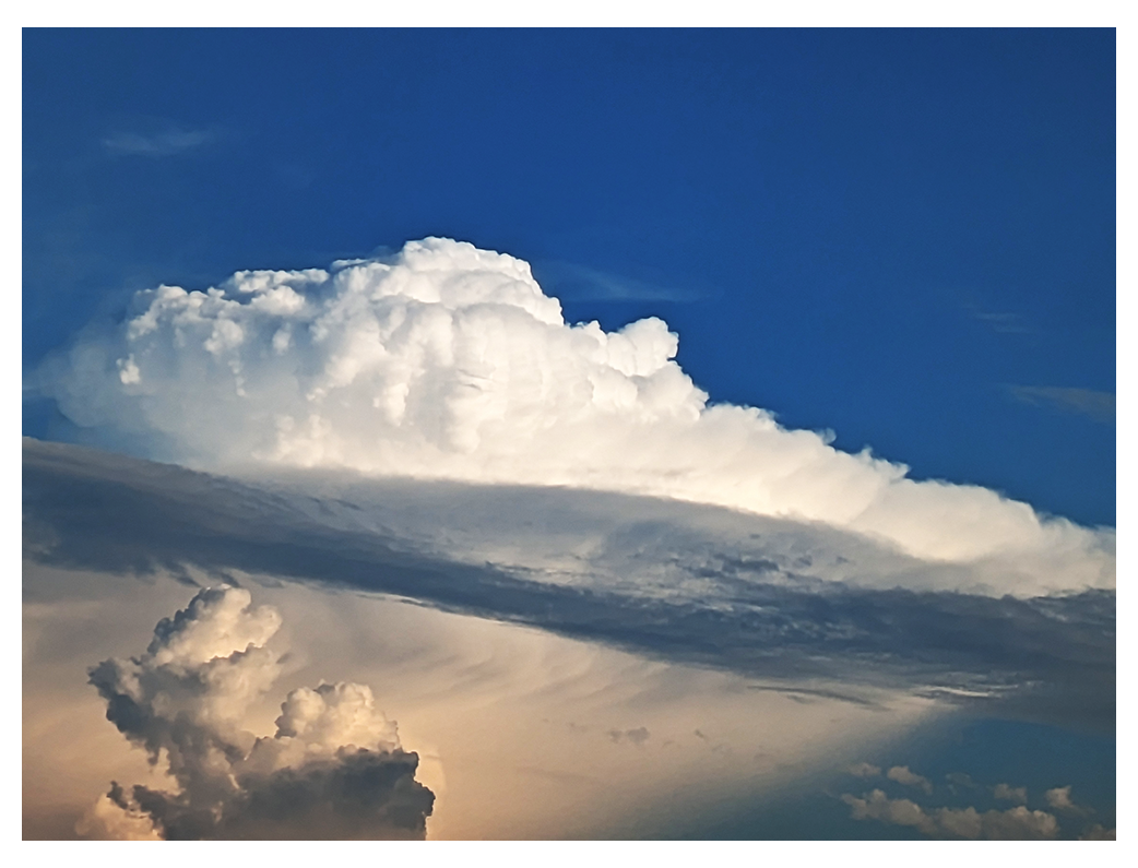A large, fluffy cumulus cloud rises against a deep blue sky, with sunlight illuminating its white, billowy edges. Below, a layer of darker gray cloud stretches horizontally, partially shading the scene, while soft clouds linger near the horizon.