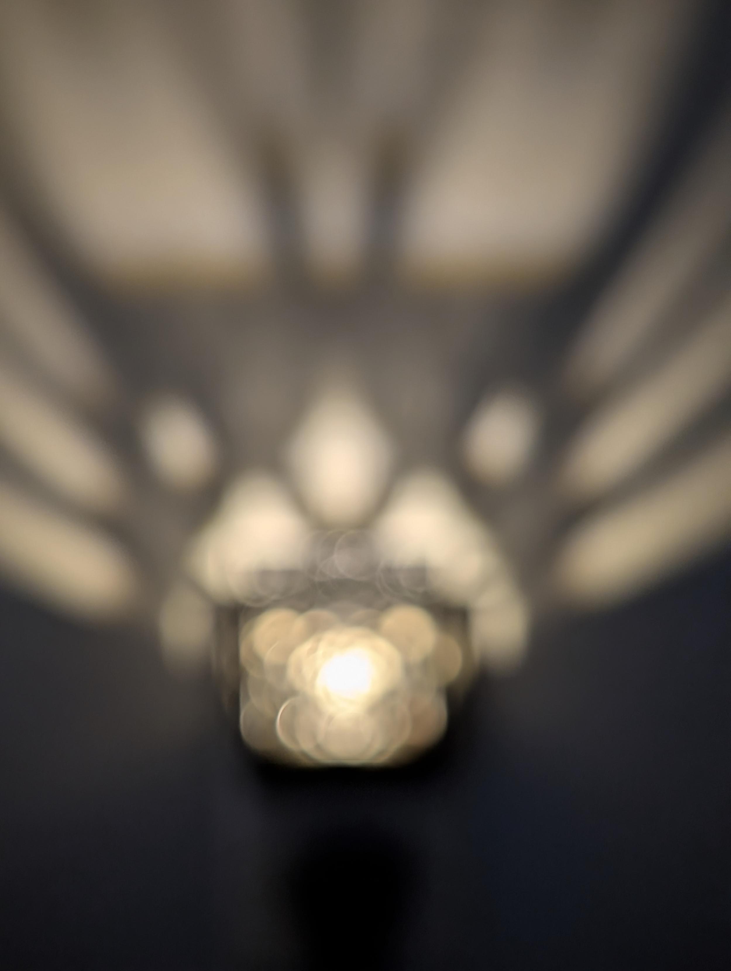abstract. close up out of focus. shot of a night light with a laser cut design on the cover, to me, looks like a face.