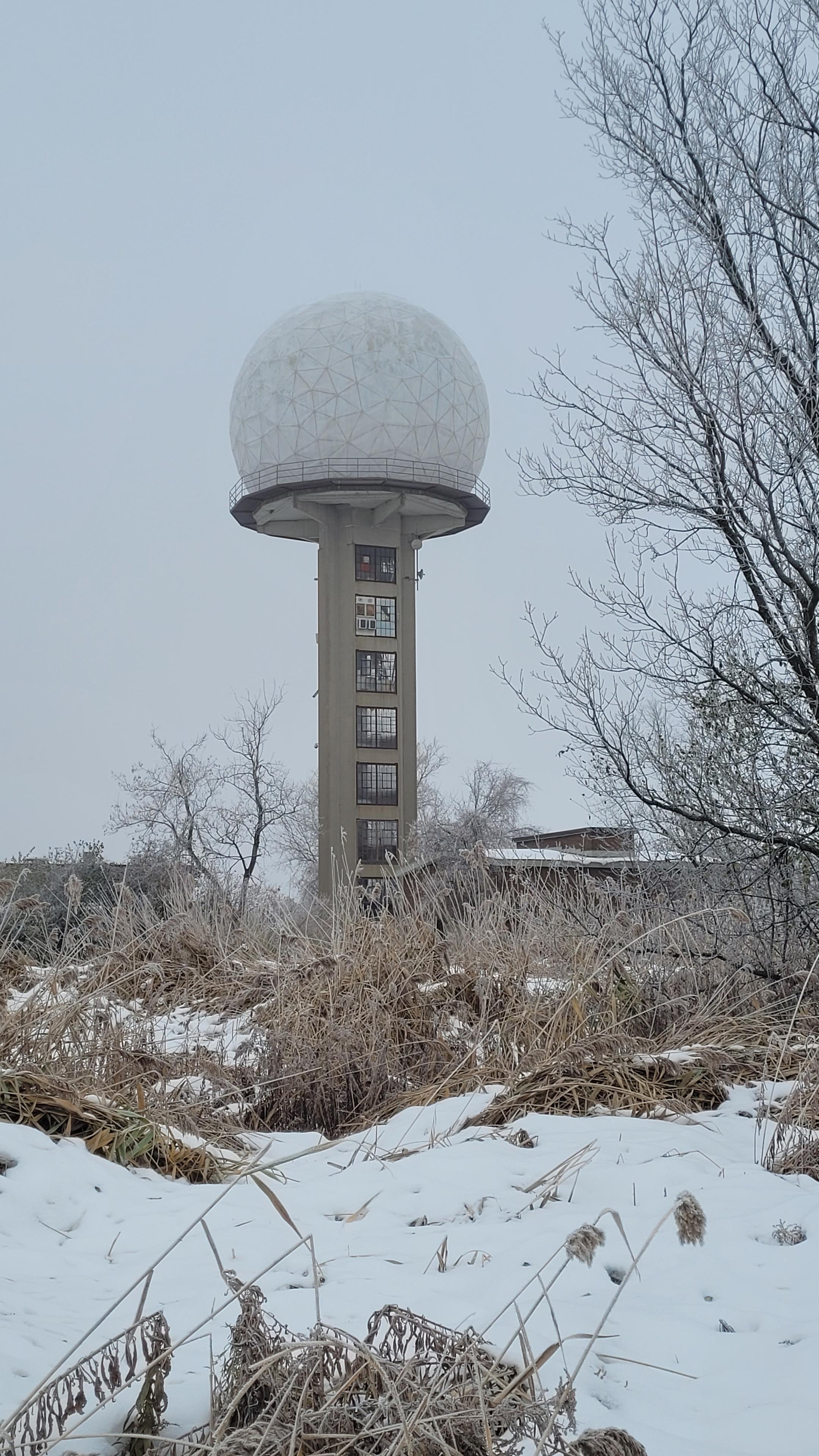 On the westernmost tip of the island of Montreal is Sainte Anne de Bellevue. Near the arboretum, there is a doppler station for weather tracking. This morning was foggy and cold, so there was hoarfrost. It was pretty. This place always feels a bit surreal, the frost added to its unreality.