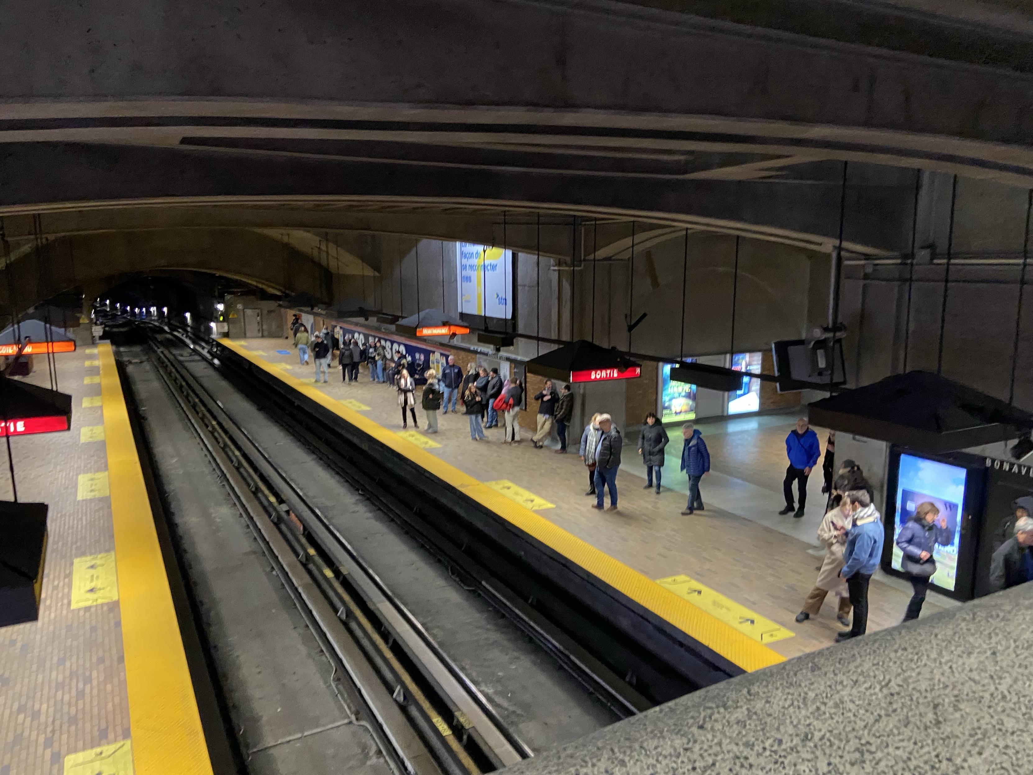 Looking down at a subway platform. Lots of people are waiting for the train on the right side. The left side is empty. Everything is framed by concrete, arching over the top and straight below.