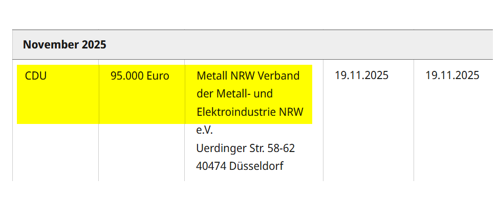 NEU: 95.000 Euro an die #CDU von Metall NRW (Verband der Metall- und Elektroindustrie NRW).