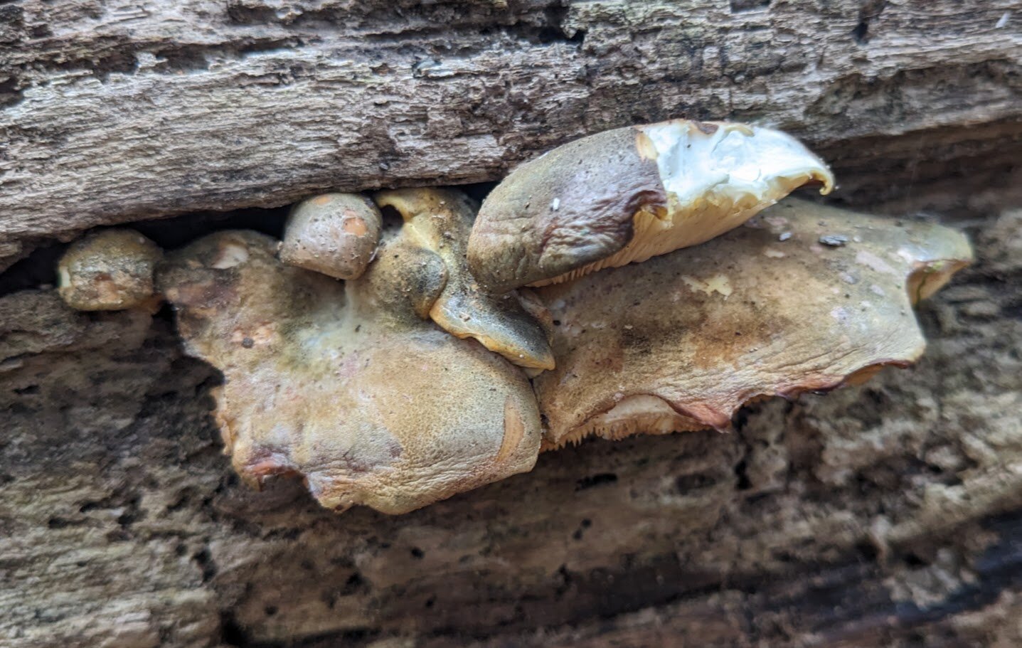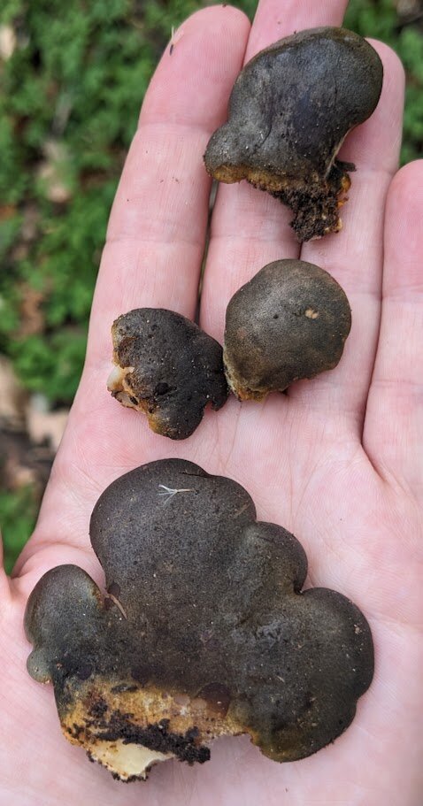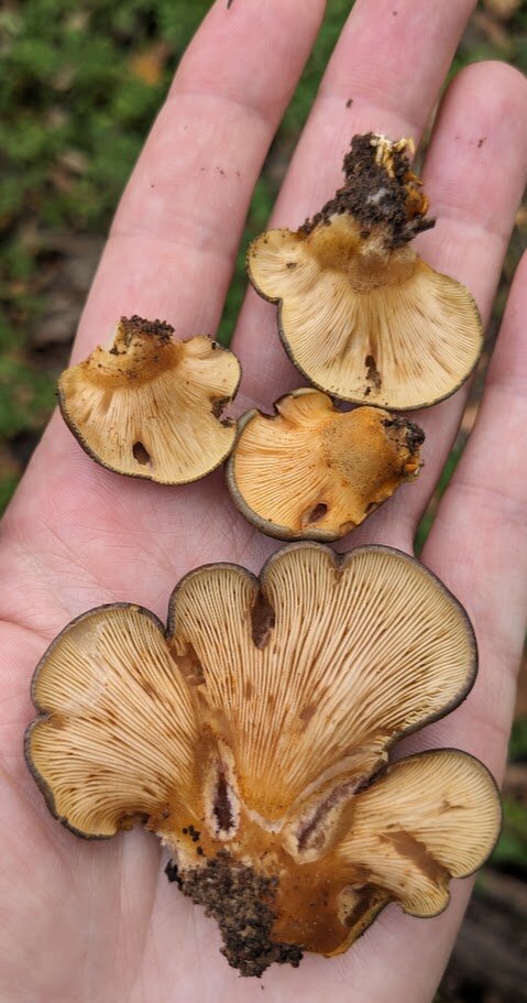 It looks like the late oysters (Sarcomyxa serotina) have started to come in! I found a handful of fair-sized ones and many, many little nubs just starting to come in. Unfortunately, even the barely formed ones I found were already getting chewed up by squirrels and beetles. I hope I can find some a little closer to home to try soon--I left these for the animals this time. #mushroom #mushrooms #fungi #mushtodon #foraging #nature