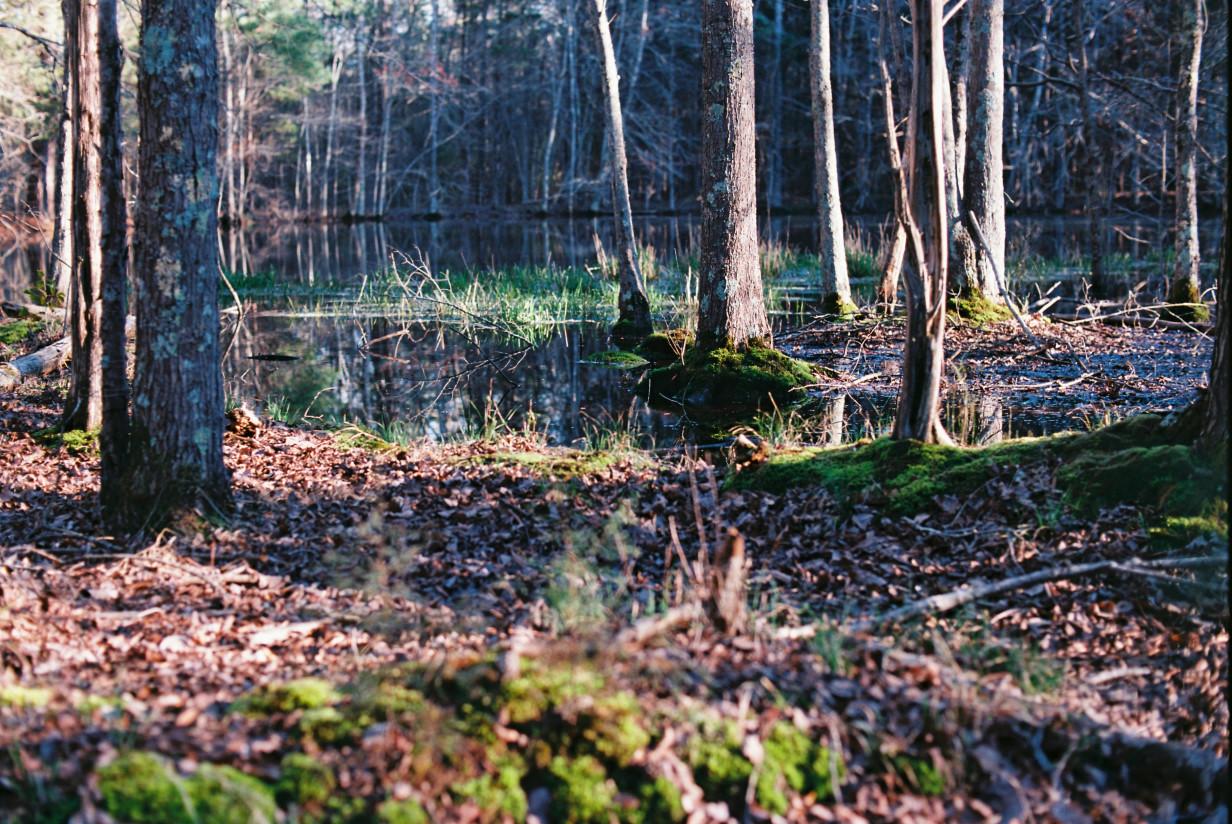 A color film photograph taken with my Nikon F3 using Kodak CineStill 400D film. A landscape at mid-range unfolds. In the foreground are mossy rills, fallen leaves, and twigs littering the ground leading in mid-frame to a marshy area with bright and dark green moss at the bottom of tree trunks jutting up from the marsh. The water around the trees is the overflow of a pond, and the sky and trees are reflected in the water. Beyond this green water plants, grasses grow. Beyond them lies the pond and, at the top of the frame, the woods beyond the pond's bank. The sun is setting, coming from the right of the frame, bright on the tree trunks that cast shadows on the grown. There is an otherworldly quality to the image, like the tree sprites are just waiting for you to look away.